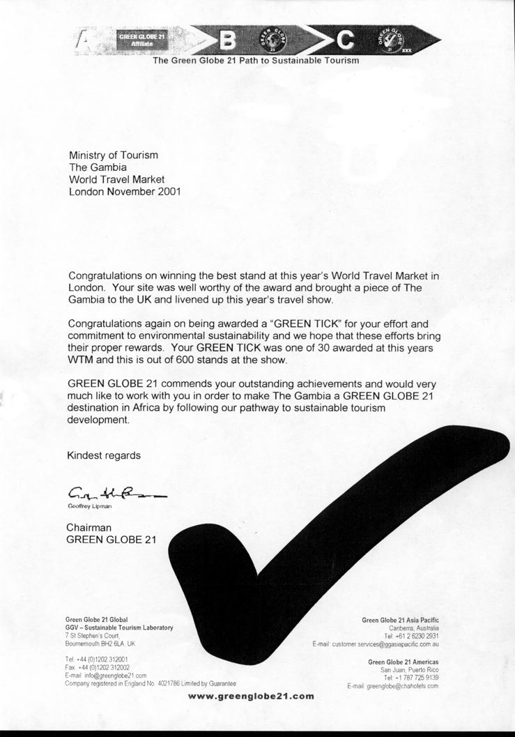 sieht man Minister und ich weiß nicht wen. Den schönen Award habe ich leider nicht mitnehmen dürfen, den hat sich das Gambische Tourismusministerium geschnappt. Für mich gab es nur eine